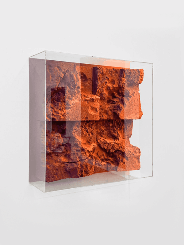Spray paint, polymer plaster on polystryene & non-wood, acrylic glass box